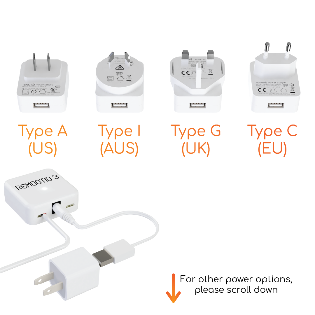 - USB power adapter (5 Volts). Compatible with type C (EU), type G (UK), type I (AU) or type A (US) sockets. Depending on where you order from, we'll send you the correct type.